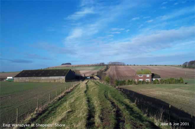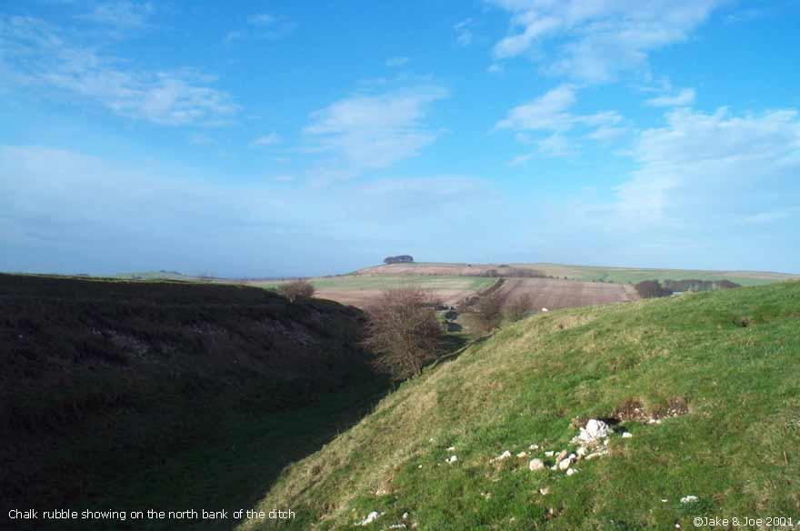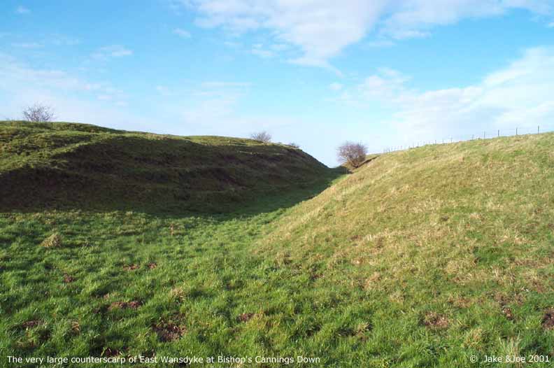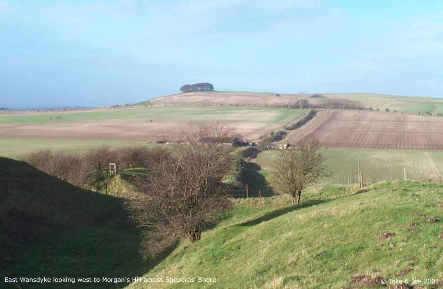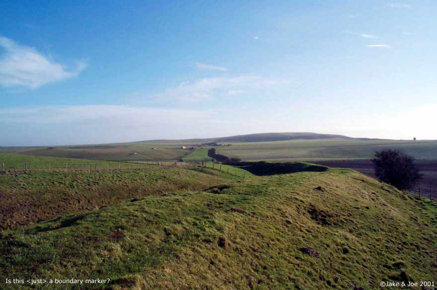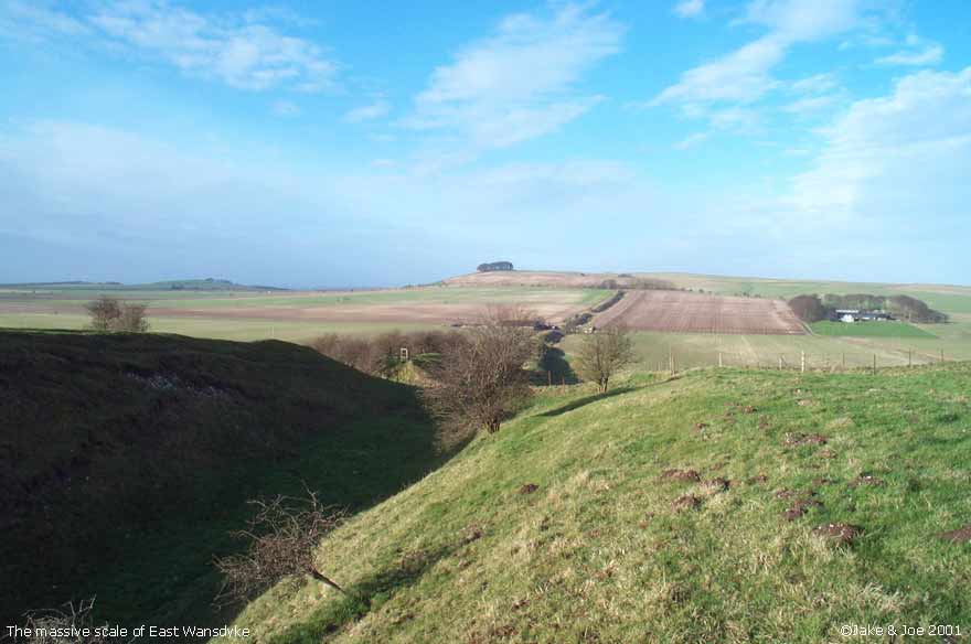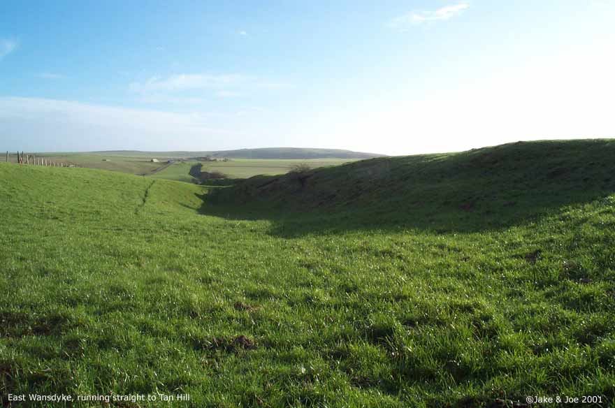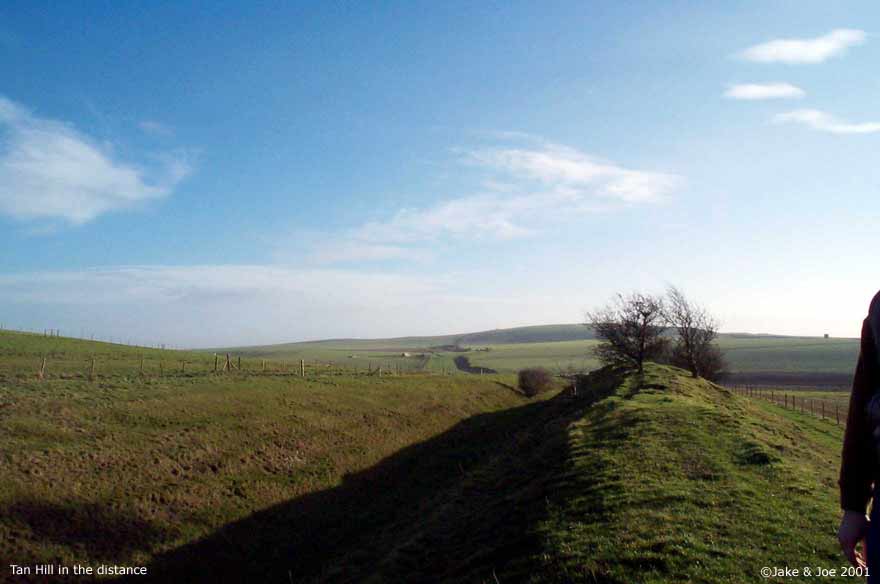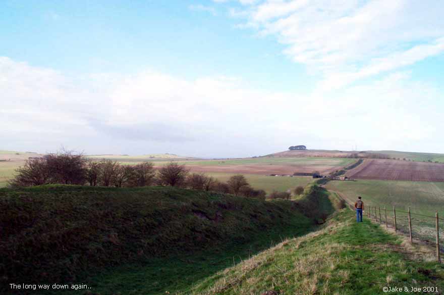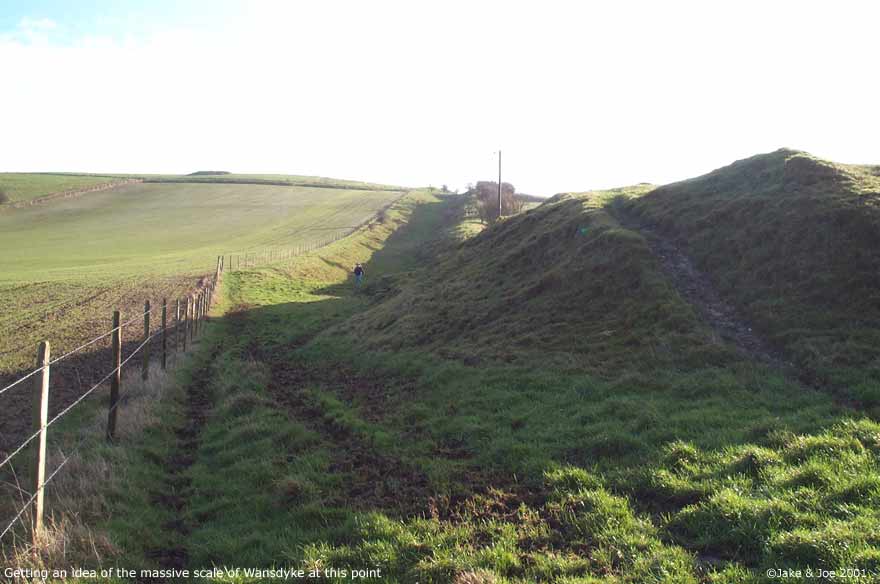 A Visit to Wansdyke - Shepherds' Shore Legendary and Literary BackgroundWansdyke is a grand bank and ditch earthwork that extends (in fragments) from just south of Bath to the Savernake Forest south of Marlborough. Helen Hill Miller sees the purpose as defensive, saying that it "was clearly built with protection against an enemy coming from the north in mind," as the ditch is on the north side of the dyke. Though it definitely has the appearance of a defensive work, it has also been proposed as a line of demarcation between territories, as such a large work would require a large army to patrol it. Edwin Guest, in his Origines Celticae, proposes that it may have marked the northern boundary of Dumnonia. This kingdom, covering from Wiltshire to Cornwall, is the area richest in Arthurian lore. Its age has been long debated, but the work is generally accepted as post-Roman and pre-Saxon, which fits nicely into the Arthurian time frame. The work is assumed post-Roman because not only does it lack the style of the Romans, but they would have no need for such a boundary in a land so indisputably controlled. The name Wansdyke in Saxon means Woden's Dyke, which suggests that it existed before their encroachment into the area. They perhaps saw this huge earthen structure and could only attribute it to one of their gods. The name also helps in dating; a polytheistic namesake would have been unlikely after the Saxon conversion to Christianity in the 630s. Location and DescriptionThe portion of Wansdyke we visited was just north of Devizes on the A361, running through the property of a farm called Shepherds' Shore. We asked for permission to visit at the farmhouse. There are, however, many other accessible sections of Wansdyke. This area, we hear, is one of the better preserved. To see a Streetmap.co.uk map of the area around Wansdyke, click here. Though you can find remnants of Wansdyke along a stretch of almost 40 miles, we chose this one because it was convenient for us. As it turns out, this area has one of the better preserved stretches. The dyke runs from the Bath area for 13 miles, then disappears for 15 before continuing on towards Marlborough for another 10 miles. Many scholars say that East and West Wansdyke were once one large work, though a few contend that these may have been two separated dykes. Wansdyke runs across the A361 by a farm called Shepherds' Shore. We could see the trench running for miles in both directions, but clearly the most interesting portion ran by the farm. We couldn't tell if the dyke was on its property or not, but we thought it best to ask permission from the owners before we hopped the fence. They weren't the most inviting people, but had no problem with us going on their property to explore Wansdyke. From trough to crest, the bank looked to be roughly 20 feet high. We walked along it for about half a mile, taking pictures and enjoying the view. Jake's Journal Entry : Got up at 8:30--took a shower last night and felt ok so didn't take another this morning--and we were ready for a full English breakfast at 9:00. It was a pretty hearty one too--cereal, toast, eggs, sausage, bacon--it filled me up and lasted a while. We set off around 9:30 for Wansdyke, the portion just north of Devizes. Had no trouble finding it. The only (minor) problem we came across was that the good part was on a private farm called Shepherds' Shore. There was a car in the driveway, so we rang the bell and the lady said it was fine if we went out on her property for a while. We were kind of concerned because there was a sign at her door that emphatically proclaimed that they were NOT a car repair shop and could NOT help stranded motorists. But she was very polite and showed us the best way to get out there. It was a big ditch. A real big ditch. We walked up and down it, taking pictures from a variety of angles, walking up the hill and down. It was real isolated countryside--you could see miles in every direction. There was a hill to the northwest of us that had one of those big chalk horses carved into the side. We missed those last time. Like everything else over here, its hard to imagine how people without helicopters or walkie-talkies accomplished such feats. And then we tried to upload the pictures. BUT the computer decided he didn't want to cooperate and froze up and still is right now, as I'm about to go to bed. Hopefully it'll work tomorrow or we're gonna have to go old school for the rest of the trip. Joe's Journal Entry: Well, the computer kind of has us in a bind right now. It has refused to boot up all day. We have shutdown and restarted it numerous times, but it always starts back to the same frozen screen. We found a computer store down the way from Marisha's Guest House, so we'll try that tomorrow. If they can't help us fix it, then the trip will become the Joe and Jake Unplugged Tour. We'll just have to rely on paper maps and regular cameras. No Worries! This morning we had a huge English breakfast. Jake and I were both stuffed. We got up at 8:30 after a great night's sleep. After breakfast, we headed to a spot on Wansdyke. Robert Vermaat told us this spot would be great for pictures. Robert runs the Vortigern Studies Website and said that this was one of the best-preserved sections of the long earthen wall. To get there, we drove past a horse carved into the white chalk hillside. The town was called Labour-in-Vain Hill. What a depressing place to live. Wansdyke, according to Ashe, was built about the time of Ambrose or Arthur and could have been a marker for the outer edge of the Cornish kingdom of Dumnonia. We drove up a road that cut through the dyke at a farmhouse. I knocked on the door and asked the lady of the house if she minded us tromping around on her property. She pointed us to a place where we could safely cross the barbed wire fence. From the bottom of the ditch (North) to the top of the ridge (South) was about fifteen feet. Maybe it wasn't quite high enough to signi