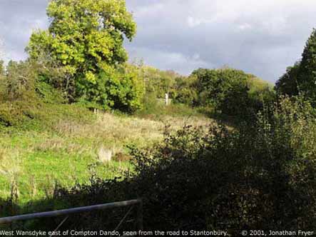 Shortly after this it looks as if the dyke and the road part company around the beginning of Glebe Wood - there's a field boundary which runs NE away from the road which resolves itself into Wansdyke about 1/2 km NW of Stantonbury. This is a pic of Stantonbury taken from the track just above Compton Dando.
