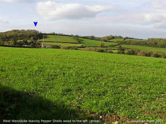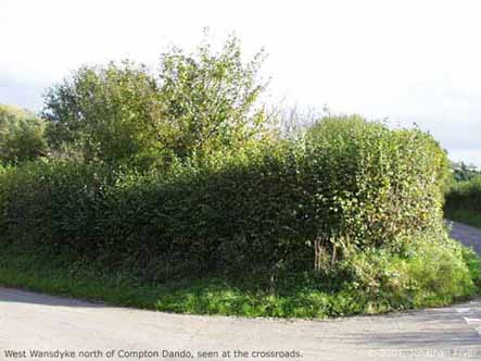 On the other side of the crossoads there's a wider than normal hedgerow running alongside the road for 1/2 a km or so which I'm sure is the dyke, its very overgrown tho. Further along still theres a patch of wood that runs to the north of the road and there's another earthwork feature which continues the line:
