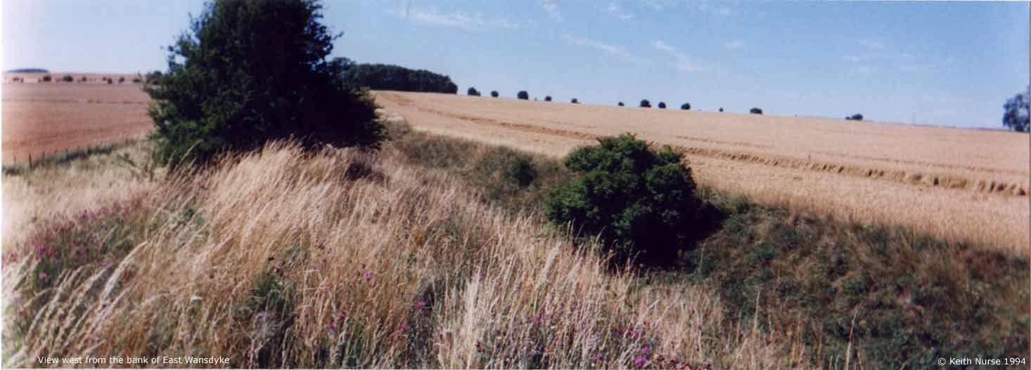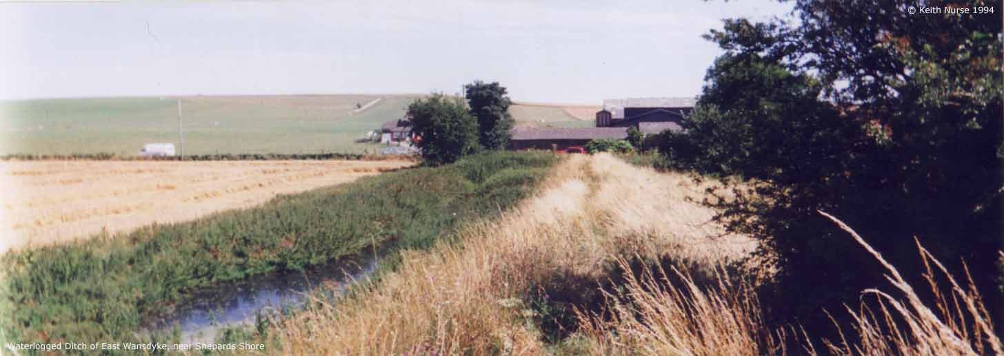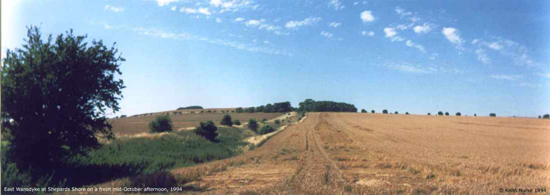 Visit to Wansdyke - Shepherds' Shore As a dominating feature in the landscape, as an ancient defensive boundary, WANSDYKE presents as powerful an image as any in the British countryside. It certainly seemed so to me, when I first came across it a few years ago, at the point where the modern road from Devizes in the direction of Avebury bisects the earthwork. The profile of the dyke came as something of a surprise. Yet its scale only became fully clear when I parked the car on a narrow farmyard entrance and trudged some distance beyond, into an adjoining field. Then, having left both car and an unamused wife at the mercy of the heavy traffic of an unexpectedly busy road, I found myself ankle deep in the stagnant mud pools of the ditch. Only then did I fully appreciate the obstacle the dyke presented. Not one of natures natural boots and rucksack types, I was quite unprepared for any form of countryside challenge, let alone the prospect of disappearing unnoticed into the quick sands of Wiltshire.