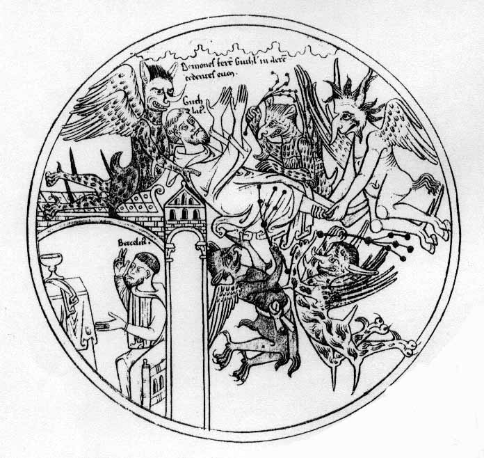 So who, in this confused past was given this image of the old demonic goat? Vortigern, no less. The traditional depiction of the anti-Christ in this context occurs in the picture from a 15th century English manuscript.[23] It shows clearly the strangely hoofed image of Vortigern.[24] The significance of the goat-like figure comes from the role of the Nordic sky god, Thor, or Thunor to the early English, who rode the heavens in a chariot drawn by goats. Depictions of goats are said to remain unknown from material evidence from the 8th and 9th centuries. This suggests that, like runes and the swastika symbol (associated with Thor) - and featured on early Anglo-Saxon brooches and pottery and sword hilts their potency as taboo symbols of paganism survived. It would be unwise to stretch the devil and demonising references too far. But it does seem that the 6th/7th century Northumbrian influence in the Welsh borderland region has been little understood. And perhaps this disguises the degree of deeper effects its warring leaders and, more importantly its churchmen - exerted in the region. The overwhelming Northumbrian success over the Welsh at the Battle of Chester, circa 616 is an important political event, just one example of how those influences began. Militant and expansionist Northumbria was a powerful force in the 7th century and, indirectly, it brought to Mercia the influence of the Celtic church, albeit but from another direction. The present-day church on the banks of the Severn at Atcham - mostly built of re-used stone from the ruins of the nearby post-Roman city of Wroxeter - bears a unique dedication, to the Northumbrian monk, St Eata, Abbot of Hexham and Bishop of Lindisfarne. He died in 685. The church is one of the earliest surviving buildings in Shropshire. At nearby Frogmore, Atcham, aerial photography has picked out crop marks of an unexcavated group of linked Anglo-Saxon (or British-influenced?) timber built halls. They are unique in Shropshire, and are strikingly similar to the seventh century royal halls of the Northumbrian kings, excavated at Yeavering.[25] The Welsh borderlands region, in its northern sector at least, is littered with references, place names and monuments that touch upon this difficult period. Sometimes they seem to confirm the evidence in the annals, sometimes almost contradicting them. Yet, strangely, together they confirm the essence of a consistent and coherent historical theme. For example, Wats Dyke clearly incorporates the magnificent Iron Age hillfort known as Old Oswestry (or Hen Dinas) a site with claimed Arthurian links - as part of its line as it travels through the area of the Shropshire border town. This is the same fort noted by the 17th century Welsh antiquarian, Thomas Pennant, as being called Caer Ogyrfan. Ogyrfan was supposedly the father of Gwenhwyfar (Guinevere). To the north of this dyke-edged borderland, is the field (Maes Garmon), near Mold, linked by local and it has to be said much disputed tradition - to the site of the famous Alleluia Victory. This conflict is supposed to have been fought in 447, when the Britons were led by St Germanus. The site, now marked by an obelisk, lies at the western end of the easiest valley route (and classic ambush point?) through the Clwydian hills. Before the battle, the area immediately around Maes Garmon is said to have been ruled by an Irish pagan (or indeed a Pelagian) chief called Benlli - from his hillfort at Moel Fenlli, the second highest peak (1,876 ft) in the Clwydian Range.[26] This was also the name of Benlli Gawr, a giant of Welsh mythology. A large, late 4th century Roman coin hoard was found at this typically aligned Iron Age rampart-and-ditch fortress.It was one of the hill forts in the west that seems to have been reoccupied in the late/post Roman period. It might be noted, in passing, that Wats Dyke - which has been confused with Offas Dyke in some places in this Flintshire region - runs a short distance away, to the east across the valley of the River Alyn. Nothing however exists here, in the annals or elsewhere, to link the dyke with that battle tradition. And tradition is no more than it might be: a ninth century attempt to connect the historic visits of Germanus with an existing local cult figure (St Garmon) in Wales. But it has to be said that not everyone agrees with that narrow interpretation.[27] More recent on-the-ground explorations of neighbouring sites have to be considered. Extensive work has been carried out on Wats Dyke in recent years by David Hill, Senior Research Fellow in Anglo-Saxon Studies, at Manchester University. But he says that the earthwork is undated, except for the recent single radiocarbon date uncovered by the Shropshire archaeologists at Oswestry. But he argues that the dyke must be later than the 6th century, and that its positioning suggests it was built in the 850s, when Gwynedd and Powys briefly became a unified state. The linking of hillforts along the dyke indicates, in his view, that the forts - possibly supported by beacon encampments - might have been used as bases by dyke patrols. But the remarkable lack of Anglo Saxon evidence from either Offas or Wats Dyke suggests, he says, that people were not settling or spending much time in what were then wild border zones.[28] The enlarged Mercia (Mierce boundary people) created by Penda (died 655) is set out in the tax list, probably of the late seventh century, and known as the Tribal Hidage. But it is argued that, when the area came under Mercian rule, Wats dyke had already been constructed and was functioning as a frontier, and that the renders in kind paid to the central court authorities (dues then approximating to then standard English units) were still commonplace in Shropshire at Domesday.[29] For centuries after its construction Wats Dyke was a striking feature in the landscape but also an administrative boundary. In some areas, where it came into contact with lands owned by the Cisterci
