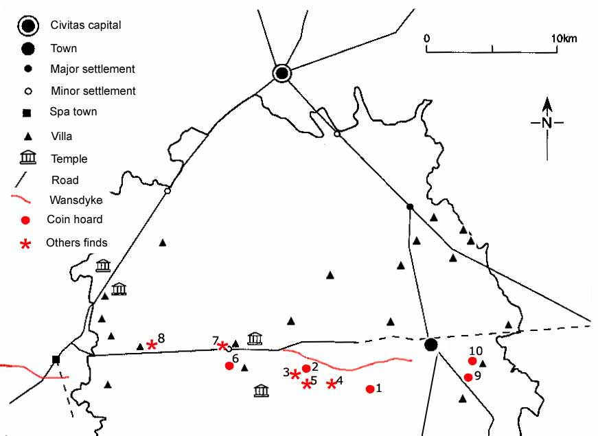 Could there be a connection between the late Roman coin hoards uncovered in the immediate hinterland of East Wansdyke and the presence of the great earthwork in this part of Wiltshire? The recent discovery of the Stanchester hoard - the latest dated group of late Roman coins yet recorded from the county - invites such a question and, arguably, even points the way to an answer. The aim of this paper is to propose that the cumulative evidence is highly suggestive and points to a late Roman/post-Roman construction date for East Wansdyke ranging between the opening years of the 5th century and circa AD 450. Highly suggestive maybe, but can it be proved that there was a relationship between the hoards and, maybe, other finds in the area and the location of the earthwork (see fig. 1)? The short answer is no. From the secretive nature of treasure concealing, it follows that coin hoards were never likely to be found on or within the immediate shadow of the dyke, still less one as imposing as this. With its commanding profile in the landscape and the subject of close monitoring, the dyke would have been the last place in which anyone would place treasure they hoped some day to re-claim. Some of the most up-to-date views on the dyke have appeared recently in Roman Wiltshire and After (edited by Peter Ellis and published by the Wiltshire Archaeological and Natural History Society, 2001). One theory cited here is that the earthwork was constructed in the late 4th century, but in discussing this Peter Fowler[1] argues that the dyke built in the Roman mode was constructed towards the end of the 5th century to face a military threat from the north. But the apparent widespread outbreak of violence following the Roman withdrawal, it has been claimed elsewhere, possibly provides the context for the final-build-up phases of both East and West Wansdyke and for Bokerley Dyke (11 miles south west of Salisbury) where it blocks a Roman road, and still forms the county boundary between Hampshire and Dorset. Both the latter and Wansdyke in fact lay close the boundaries of the territories of adjoining civitates. More specifically, it has been suggested that the north-facing East Wansdyke may have been built close to the boundary between the Belgae and the Dubonni, based, as they were, on the cantonal capitals of Venta Belgarum (Winchester) and Corinium Dubunnorum (Cirencester). Further south, in south-west Wiltshire, the Old English place-name of Teffont is considered to suggest the presence of the eastern boundary of the Durotiges, based on Dorchester. The presence here of coins (the latest of them of Honorius, (AD 395-423) and other material uncovered points to the existence of a shrine site[2]. Cantonal organisation, of a diminishing and reducing form, must have still been in force, and if so, it may have heightened tensions and triggered rivalry over resources between neighbours in the late Roman, early post-Roman periods. Ken Dark argues that the boundary, if not Wansdyke itself, must have been in place by the sixth century at least and that, on balance, it is a 5th /6th century British linear boundary, facing north and incorporating hillforts in its line[3]. Fig. 1: A map of north Wiltshire
